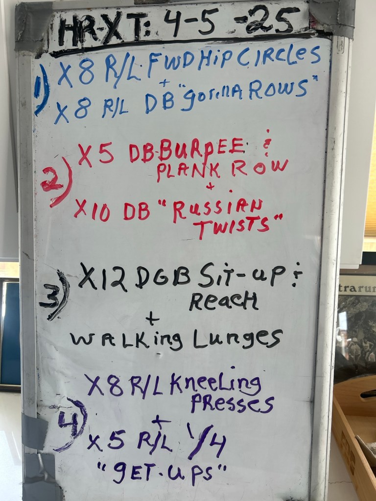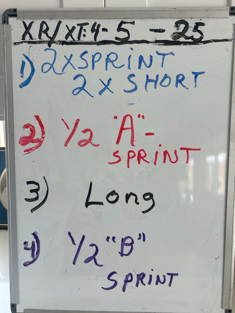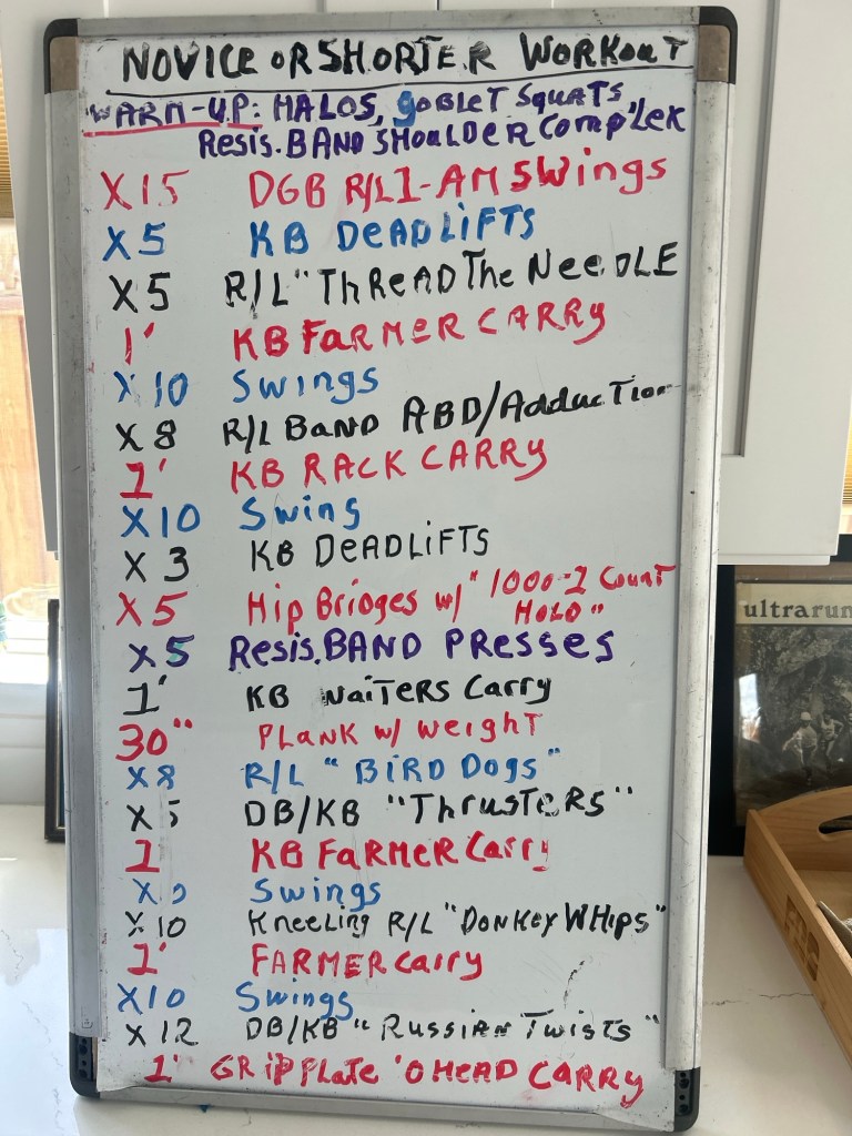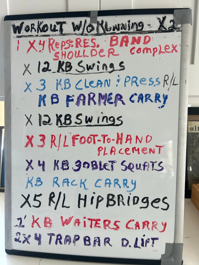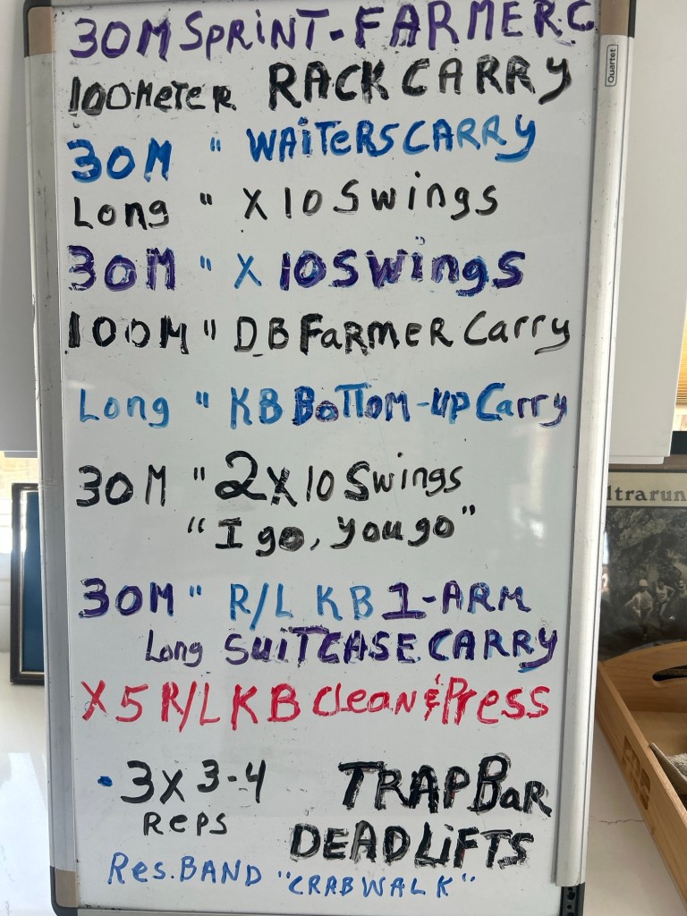 Then it is on to the next whiteboard with the second half of the workout with sprints, loaded carries, KB swings, presses, mobility and deadlifts,
