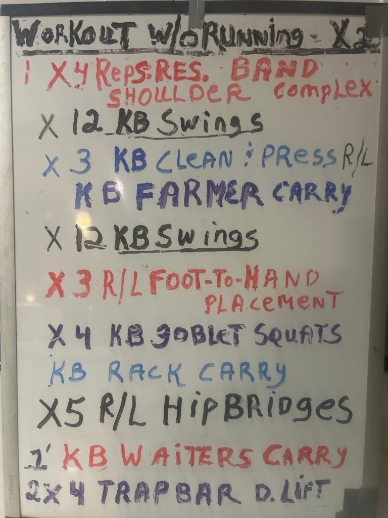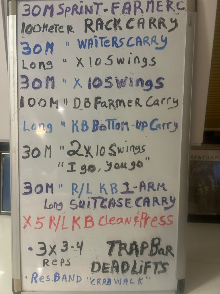 Then go to the next whiteboard for the second half of workout with sprints, loaded carries, swings, KB lifts; then finish with Trap Bar Deadlifts and resistance band “crab walks”.