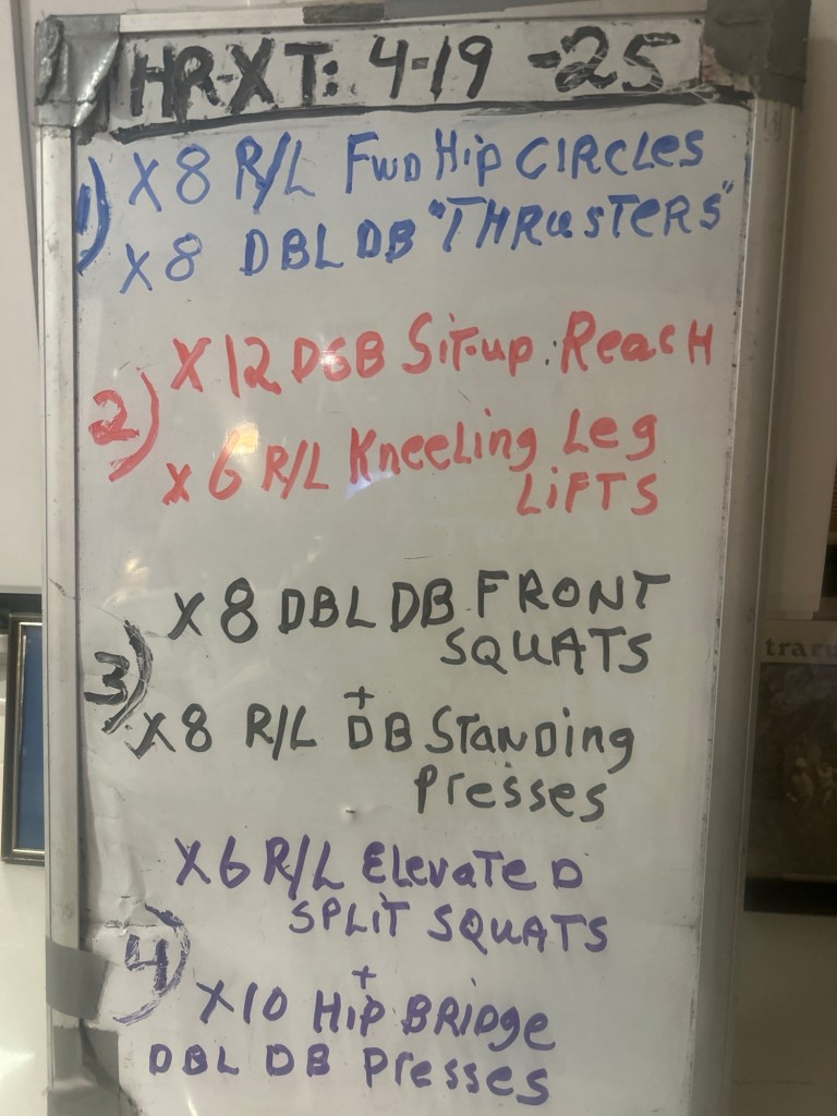 4/16/25 WEDNESDAY. STRENGTH TRAING CIRCUIT/SWINGS/ MOBILITY/DEADLIFTS.. 8 AM at Warren’s gym. The exercise stations are there for your circuit workout.