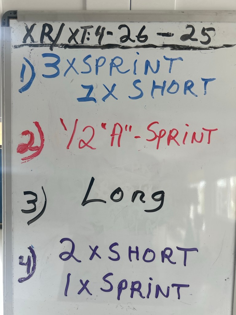 4/22/25 TUESDAY. TEMPO run pieces at a 10K race effort so that is’s a highly aerobic effort but under control. After the warm-up mile pick up the pace and run