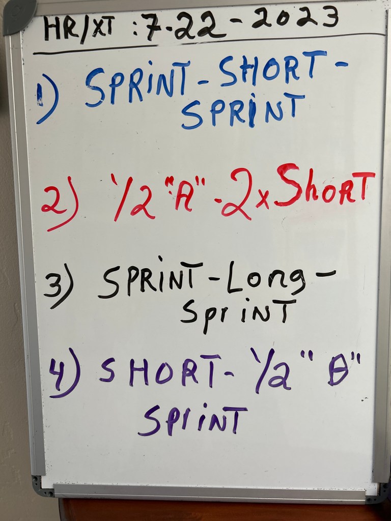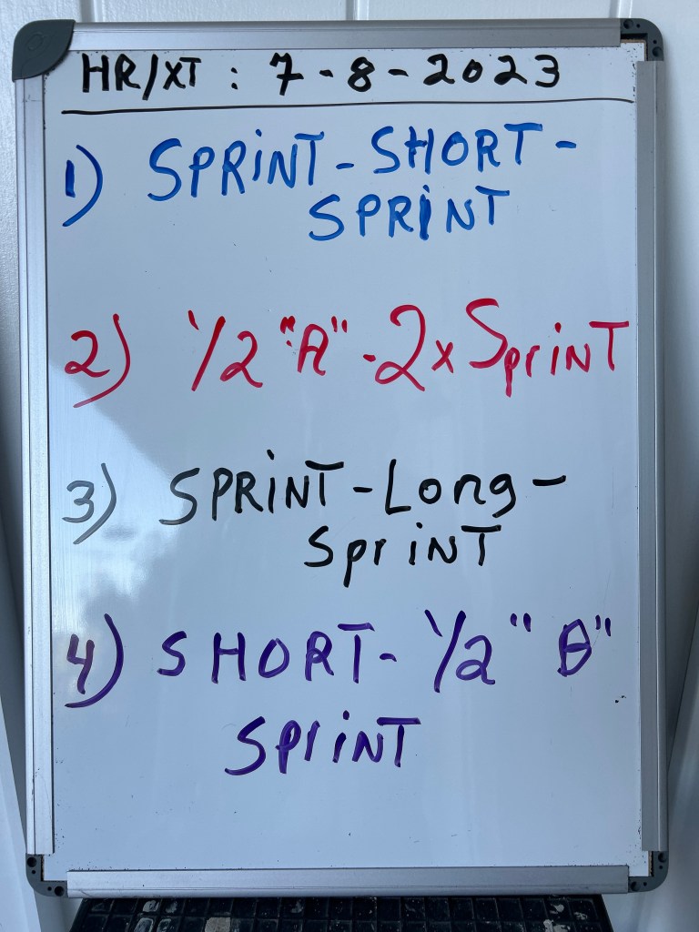 8/24/23 THURSDAY. SPEED-WORK at your local track. After the warm-up mile, skips, 6 x 30 meter repeats, 2 x 100 (100), you’ll do 3 rounds of: