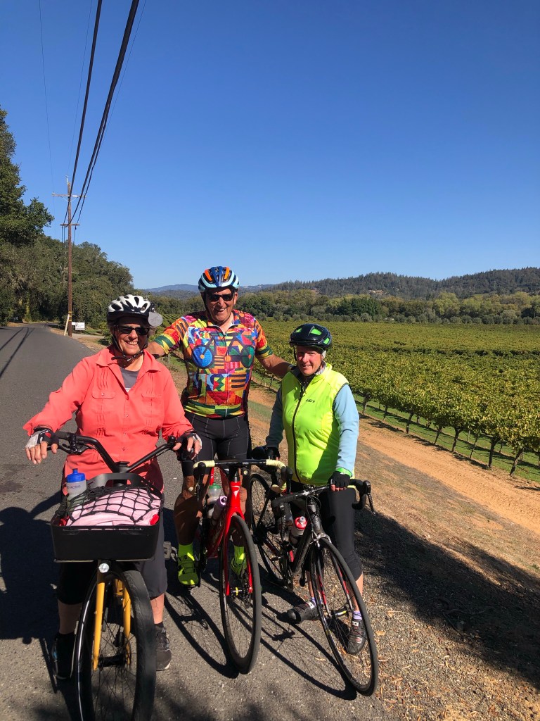West Dry Creek Road goes along nine miles of vineyards in Alexander Valley, part of the 100K course with Asti Tour de Vine on 10/8/22 – on a perfect Fall Day! ( Sandy, Eric, Ann in photo)