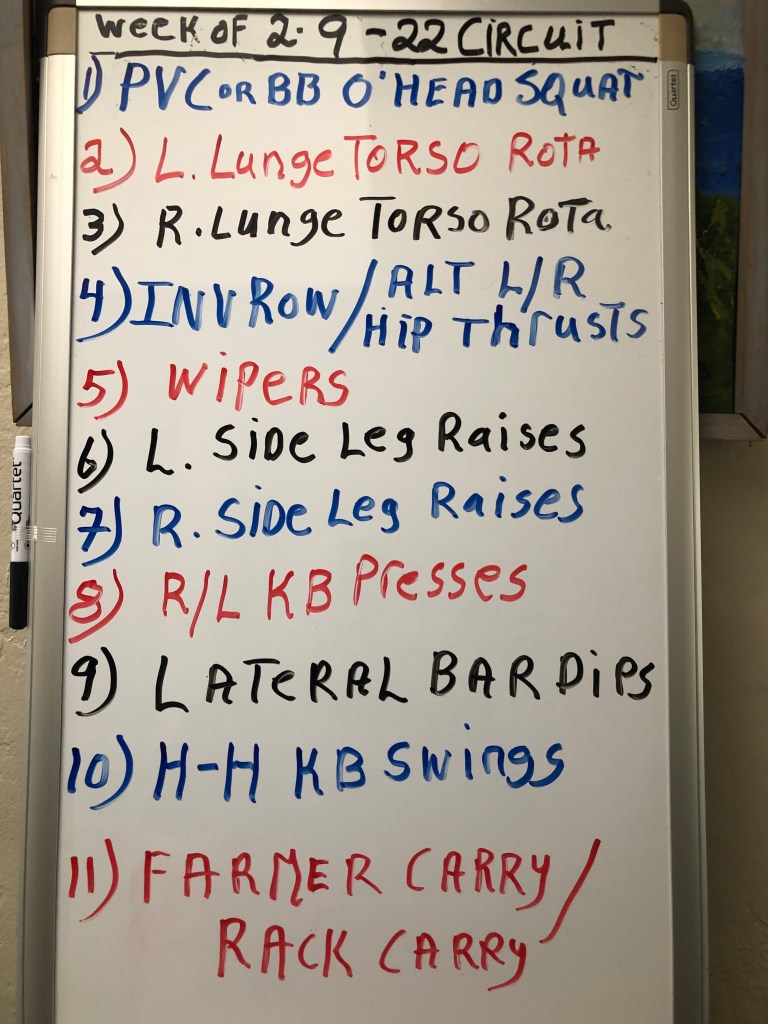 3/9/22 WEDNESDAY. STRENGTH TRAINING CIRCUIT. 8:15 am start at Warren’s. After the warm-up routine with ROM and mobility exercises we’ll do the Circuit with 35″ exercising followed by 25″ moving to the next station and rest.