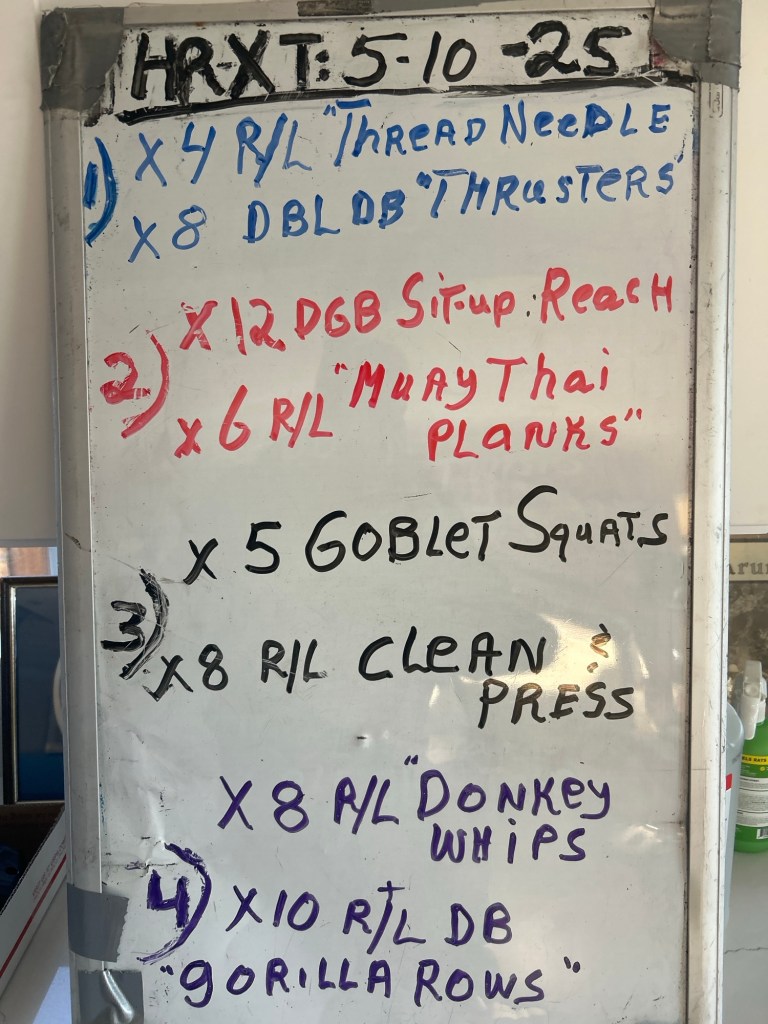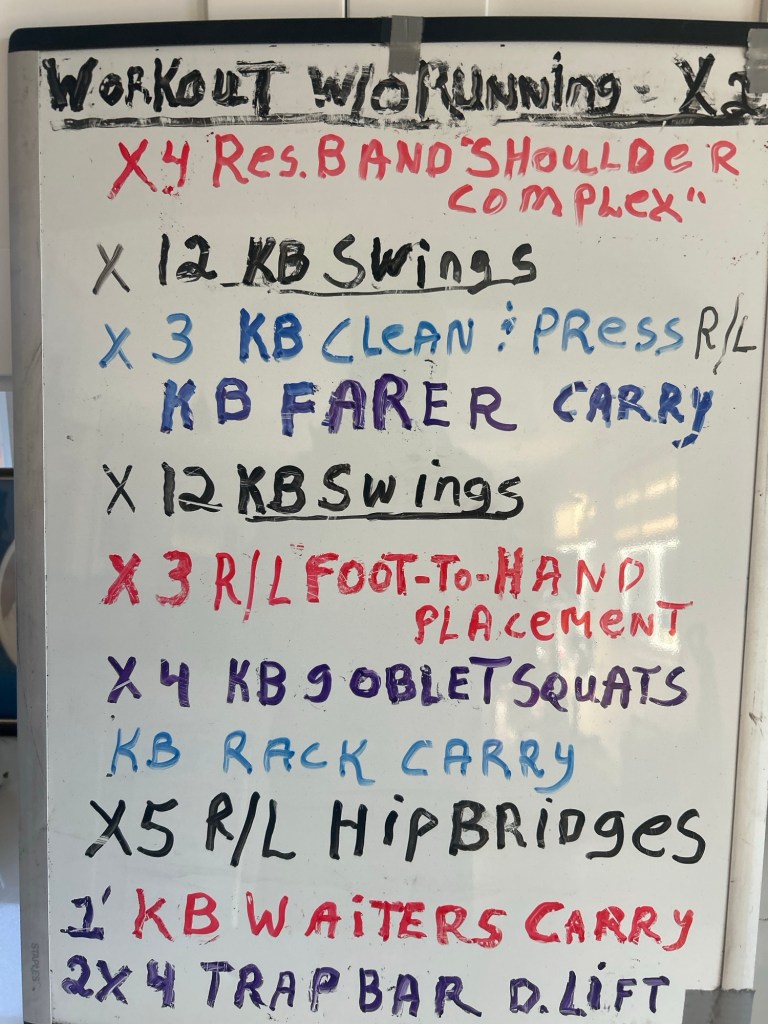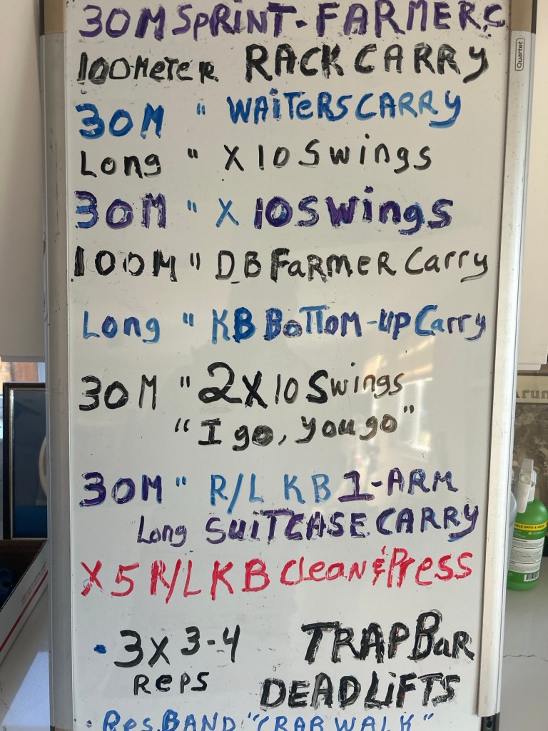 Then it is on to the next whiteboard with the second half of the workout with sprints, loaded carries, KB swings, presses, mobility and deadlifts,