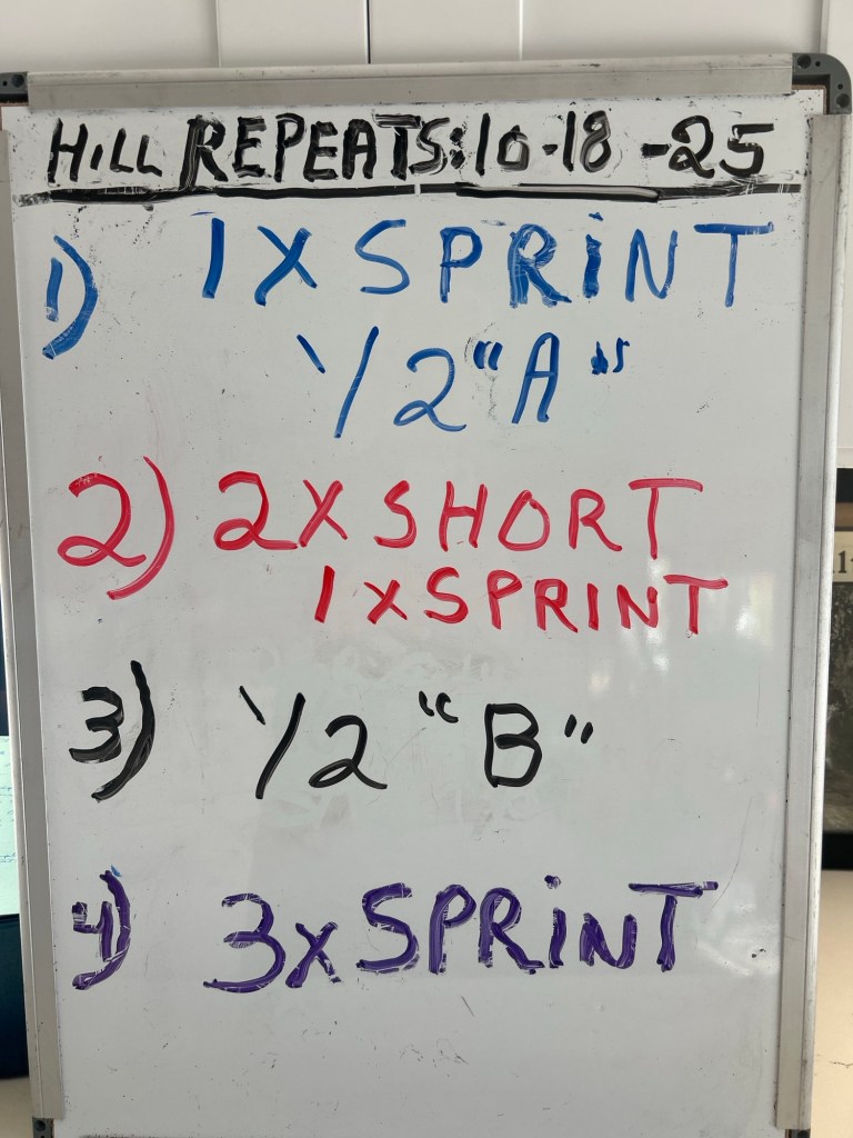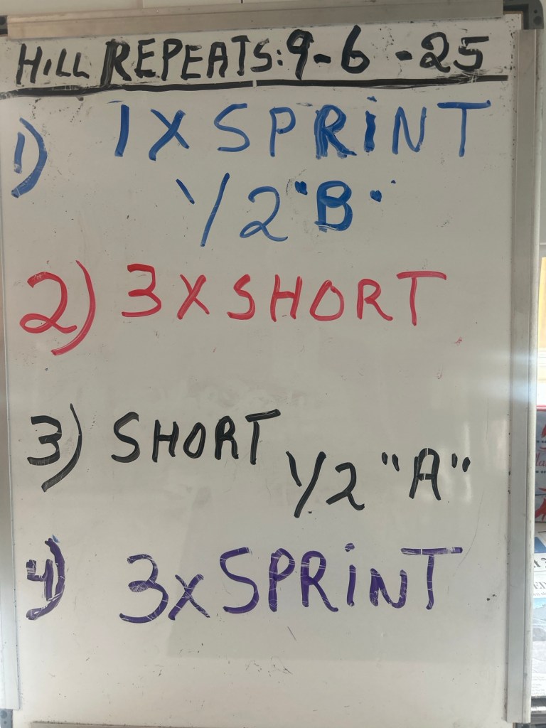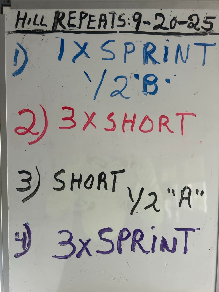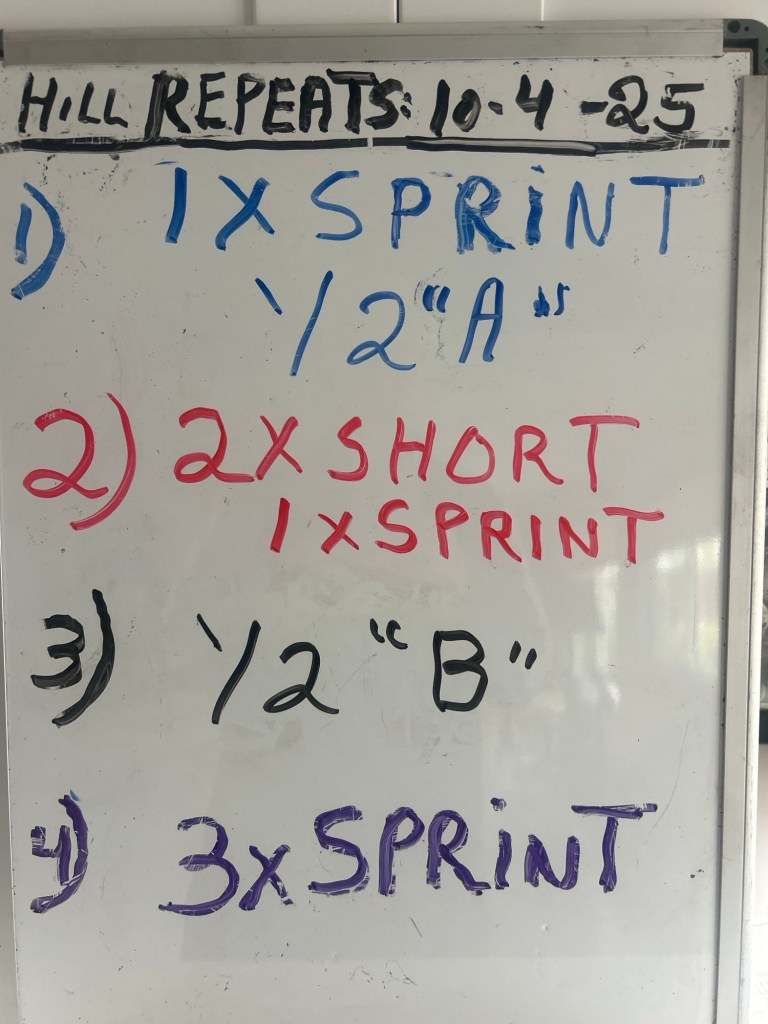 10/16/25 THURSDAY. SPEED-WORK at your local track. After the warm-up mile, skips, butt-kicks and 6 x 30 meter pick-ups.