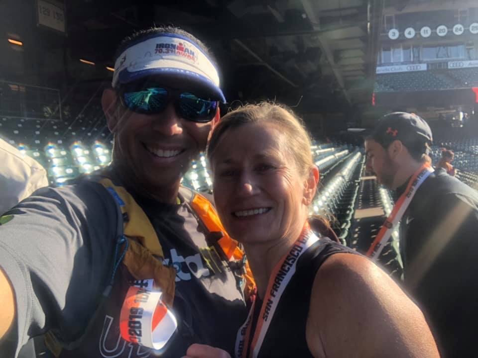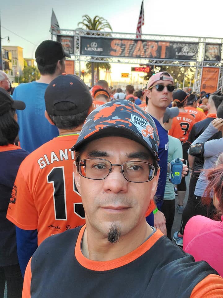 Below : BRIAN WONG and KATHY BARTON both won their age groups at the Giants Run in SF; GERALD AGANZA got in a selfie at the same event. A solid run and entertainment at the finish in the ball park.
